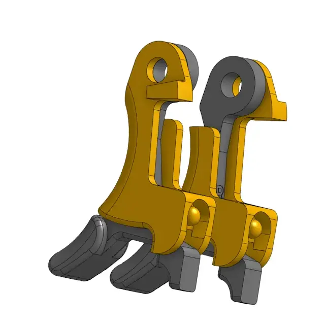 Originally, the joystick had a compression spring that sat between the plastic trigger paddle and the switch itself. The spring rested on the switch in such a way that as the spring was compressed, that compression would activate the switch at approximately half the throw of the trigger. I maintained that functionality with the wraparound nub shown here in the CAD image. The original stick had an extension of the trigger arm that would simply press the 2nd switch when pulled far enough. In my new design, that became a separate trigger arm that sat within the primary trigger (shown here in grey). It was held in the forward position by a 4mm spring that was sandwiched between the two stages.